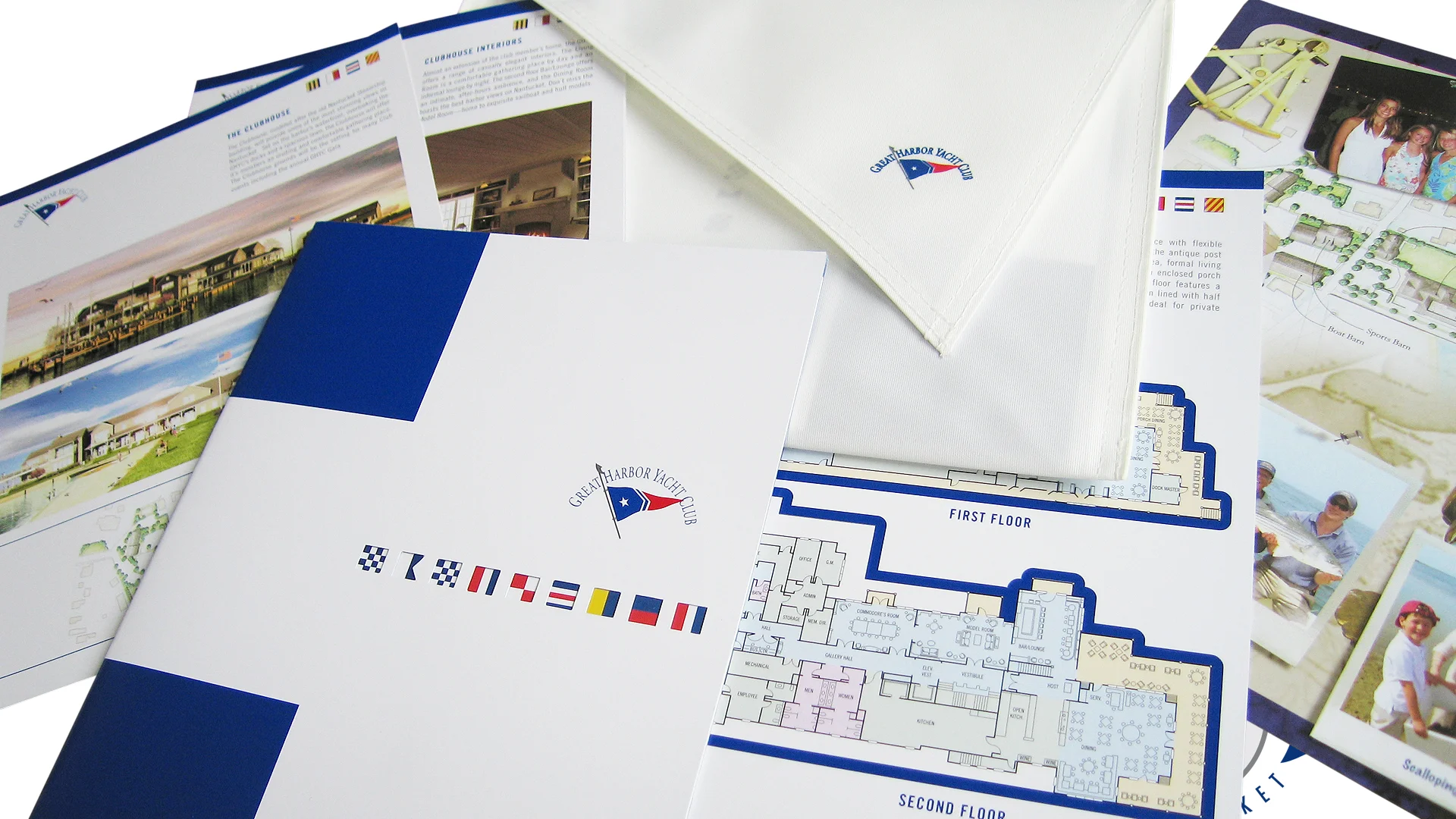 Barnburner's design capabilities were on full display in our partnership with Great Harbor Yacht club. Tasked to design a member invitation package with little more than the new logo for inspiration, and the actual club yet to be constructed, our design team studied site plans to create awe-inspiring rendered images representing everything soon-to-be members could expect from the club..A 12-page brochure accompanied the invitation, offering renderings, floor plans, amenities, and all the club had to offer in a sleek, and engaging presentation. For an extra hook, the communication was delivered in a custom package constructed from actual sail cloth embroidered with the Great Harbor seal and logo. The result? All memberships were sold out before even the clubhouse was completed